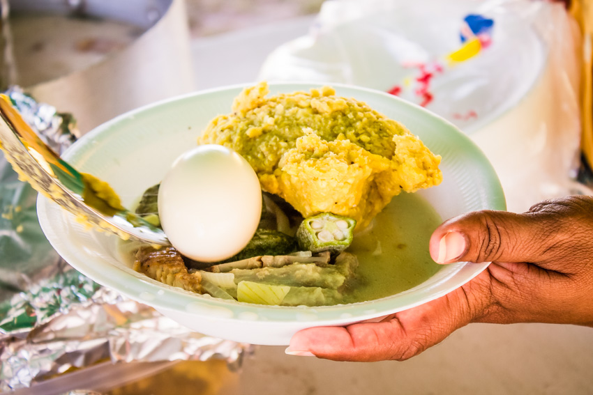 The food of the Garinagu mainly features local crops like plantain, banana, cassava, yam as well as a variety of seafood. One of the main Garinagu dishes is the hudut. This is a coconut-based fish soup that is served with plantains mashed in a traditional mortar. There is also a variety of other meals which include coconut milk like bundiga and tapóu. There is also the ereba which is the cassava bread.